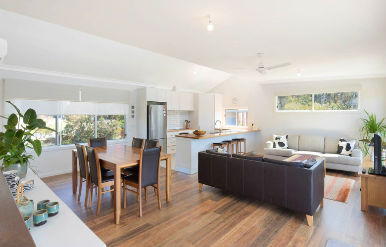 The split skillion roofline not only makes this area feel larger, but it also allows for additional windows to be placed at the top of the raked ceiling ensuring the sun can shine through and lighten up the area even further.